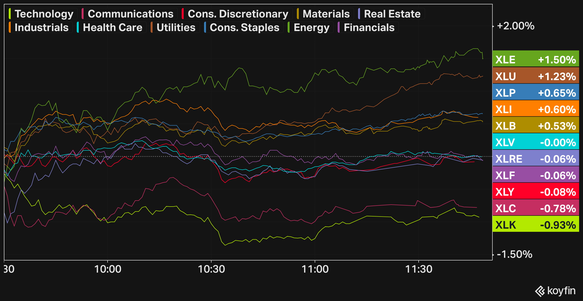 The Energy Select Sector SPDR Fund (NYSE:XLE) rose 1.5% on the day, outperforming all other ten sectors. The Utilities Select Sector SPDR Fund (NYSE:XLU) gained 1.2%, drawing flows towards defensive industries.