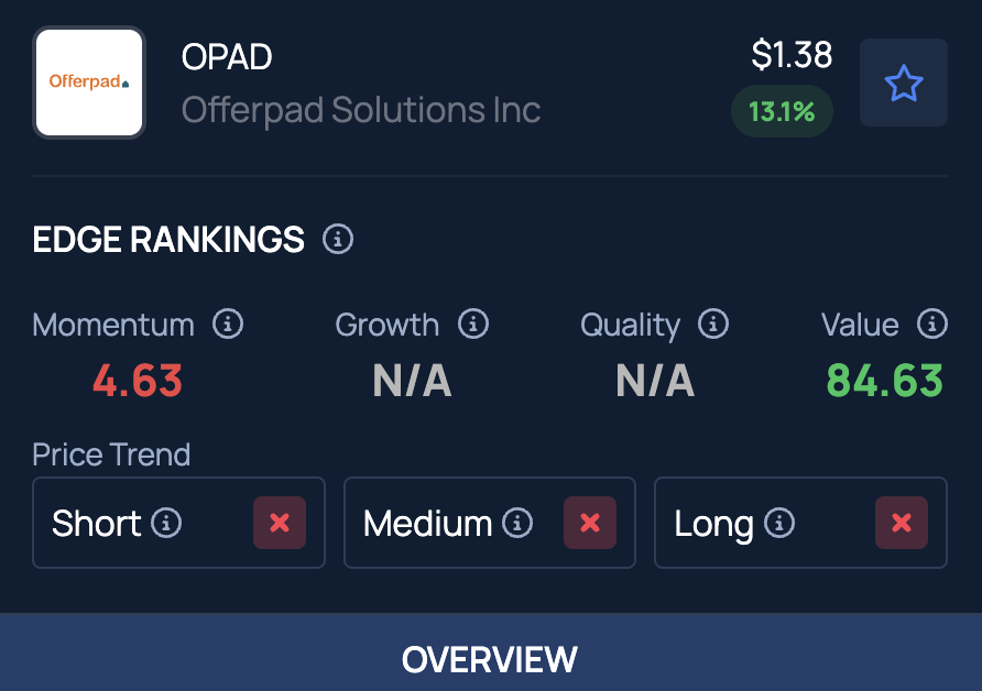 Offerpad Solutions Inc. (NYSE:OPAD) jumped 25% in Tuesday's pre-market session, rising to $1.50 after closing at $1.20 on Monday, according to Benzinga Pro data.