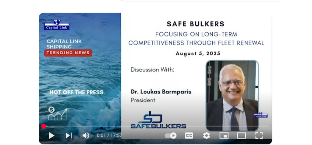 In this episode of Capital Link's Trending News Webinar Series, Dr. Loukas Barmparis, President of Safe Bulkers (NYSE:SB), offered updates on the company's strategy amid ongoing dry bulk market volatility, accelerating regulatory pressure, shifting global trade flows, and initiatives to renew and decarbonize its fleet.