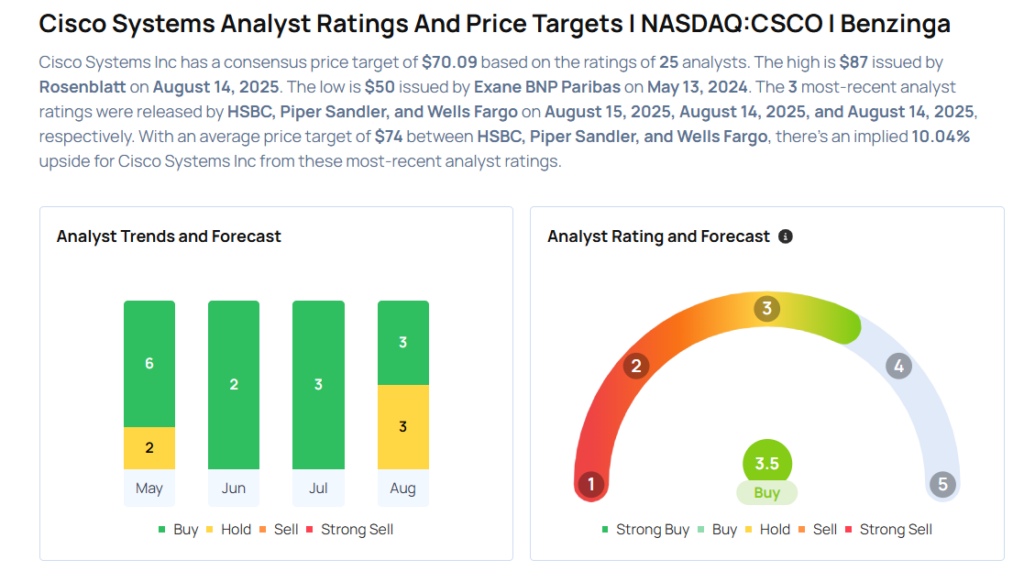 HSBC analyst Stephen Bersey downgraded the rating for Cisco Systems, Inc. (NASDAQ:CSCO) from Buy to Hold and announced a $69 price target. Cisco shares closed at $69.30 on Thursday. See how other analysts view this stock.