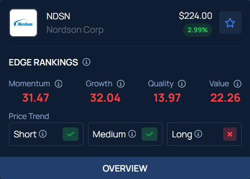 According to Benzinga Pro data, NDSN closed regular trading at $213.52, down 1.83% for the session. The stock trades at a price to earnings ratio of 27.47 with a market capitalization of $12.07 billion. Recent analyst upgrades include Oppenheimer‘s Christopher Glynn raising the rating to Outperform with a $260 price target, citing strong fundamentals.