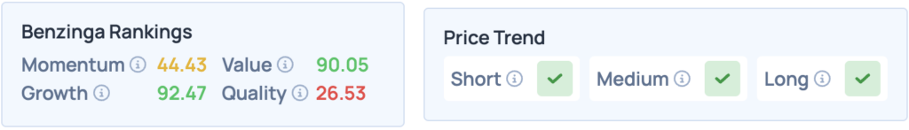 According to Benzinga’s Edge Stock Rankings, the stock scores high on Growth and Value, and has a favorable price trend in the short, medium and long terms. Click here for deeper insights into the stock, its peers and competitors.