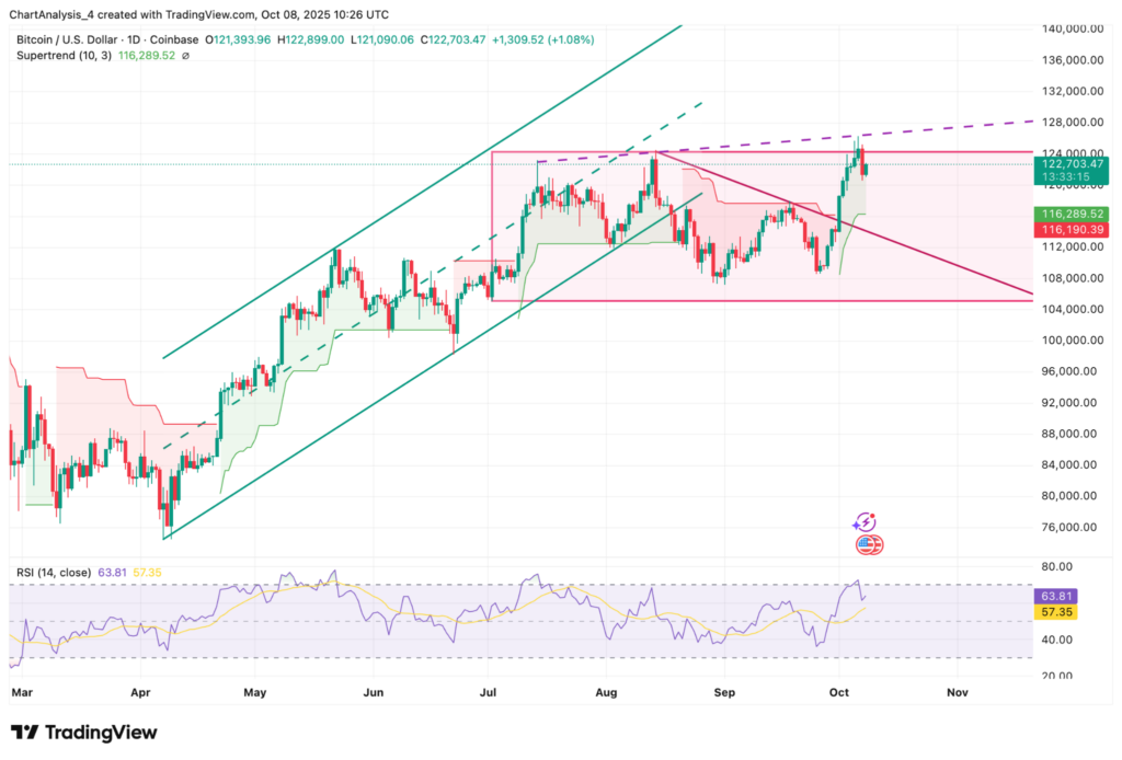 The daily chart shows Bitcoin breaking out of a two-week consolidation, pushing into the $122,000–$124,000 resistance band.
