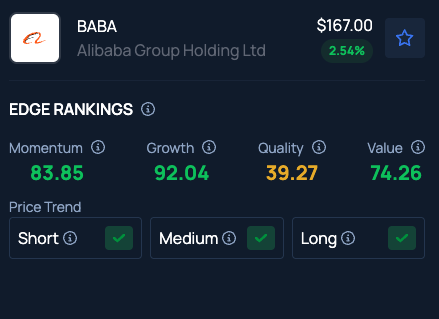 Benzinga's Edge Stock Rankings indicate Alibaba stock has a Quality in the 39th percentile. Here is how it compares to other Cathie Wood holdings, such as AMD.