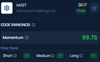 With a strong Momentum in the 99th percentile, Benzinga’s Edge Stock Rankings indicate that MVST has a positive price trend across all time frames. Here is how the stock fares on other parameters.