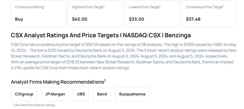Analysts expect the Jacksonville, Florida-based company to report quarterly earnings at 42 cents per share, down from 46 cents per share in the year-ago period. The consensus estimate for CSX’s quarterly revenue is $3.57 billion, compared to $3.62 billion a year earlier, according to data from Benzinga Pro.
