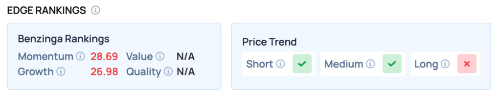 Stellantis scores poorly on the Momentum and Growth metrics, but offers a favorable price trend in the Short and Medium term. For more such insights, sign up for Benzinga Edge Stock Rankings today!