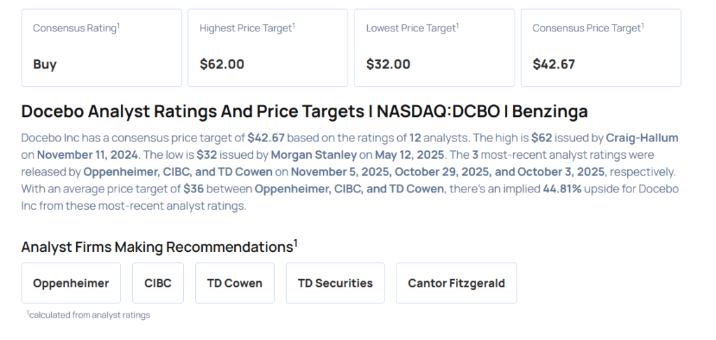 Oppenheimer analyst Ken Wong initiated coverage on Docebo Inc. (NASDAQ:DCBO) with an Outperform rating and announced a price target of $35. Docebo shares closed at $24.61 on Tuesday. See how other analysts view this stock.
