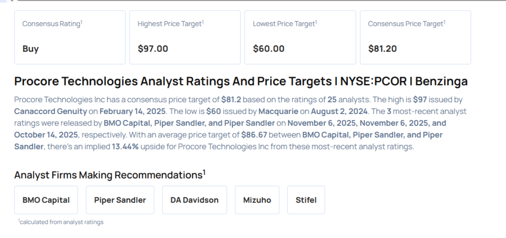 Procore Technologies shares closed at $71.54 on Wednesday.