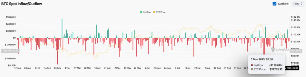 CoinGlass data shows another –$130 million net outflow from spot exchanges today as of Nov. 7.