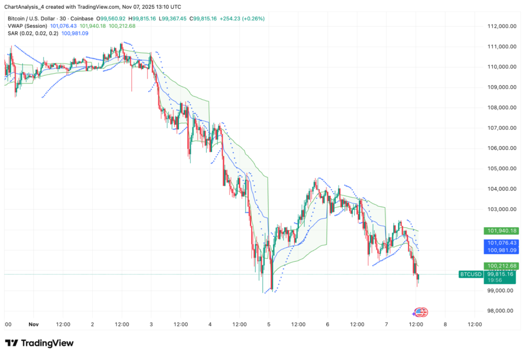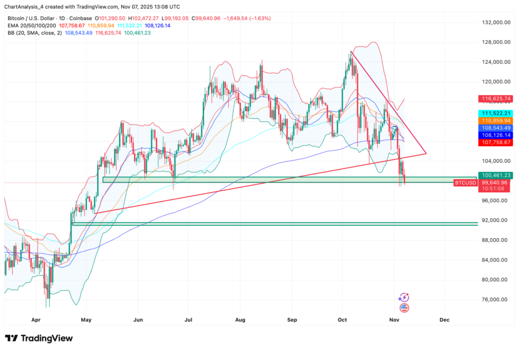 Bitcoin (CRYPTO: BTC) sliced below $100,000 on Friday morning, giving sellers a clean runway toward the $92,000 demand zone.