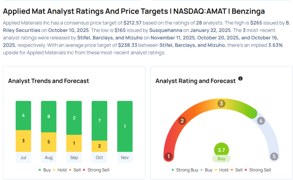 Analysts expect the tech company to report quarterly earnings at $2.10 per share, down from $2.32 per share in the year-ago period. The consensus estimate for Applied Materials’ quarterly revenue is $6.67 billion, compared to $7.04 billion a year earlier, according to data from Benzinga Pro.