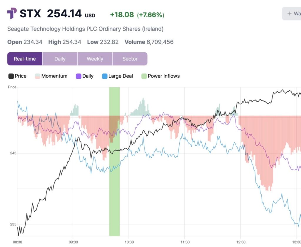 Seagate Technology Holdings Inc. (NASDAQ:STX) experienced a significant Power Inflow alert, a key bullish indicator that is closely tracked by traders who value order flow analytics, specifically institutional and retail order flow data.